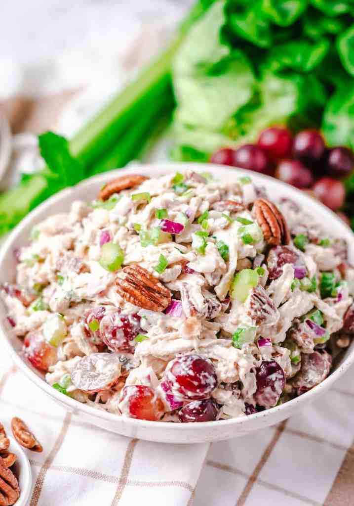 Note: I made this with freshly roasted chicken breasts, pecans, celery, red onions and grapes. If it’s going to stay over a day or two for lunches, I would suggest using the dried cranberries instead of the grapes.