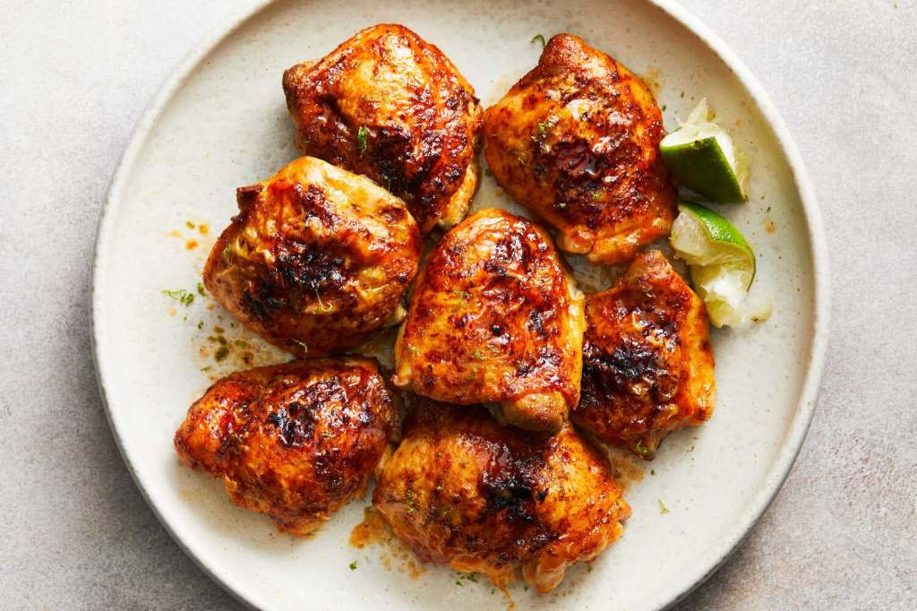 Generously seasoned with salt, pepper, and onion and garlic powders, these sweet and spicy chicken thighs are roasted at a high temperature to maximize the crispiness of the skin. Halfway through cooking, the chicken is brushed with a butter-and-hot-sauce blend. Finally, honey and lime zest are whisked into the remaining hot sauce butter to coat the fully baked chicken thighs. A squirt of tangy lime juice provides balance and the perfect finishing touch.