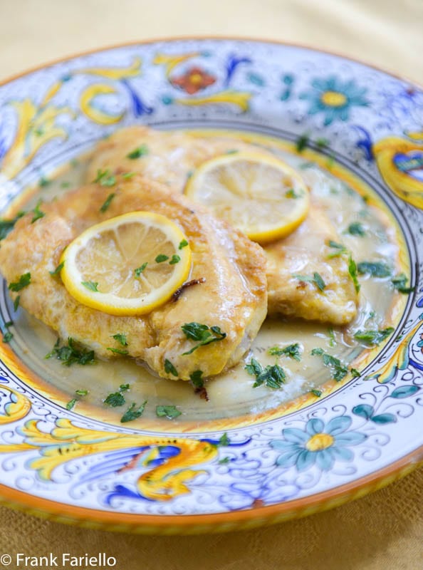 Memorie di Angelina: “This is basically a chicken breast piccata but one where you first dip the chicken breasts in a light egg batter and pan-fry them to a golden brown before simmering them in a sauce of wine, chicken broth and lemon. The savory egg batter and lemony sauce really do wonders for the rather bland flavor of the chicken breasts.”