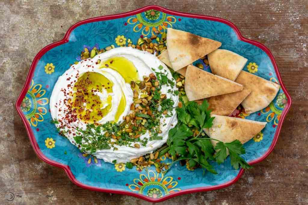 Garnish and Serve! Transfer the feta dip to a serving plate and smooth the top of the feta, making a well in the middle. Drizzle more olive oil all over and add the Aleppo pepper, herbs, and nuts. Serve with pita chips or pita wedges.